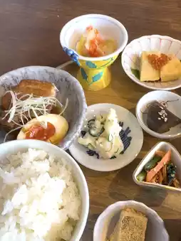 Features a large piece of kakuni (braised pork belly), dashimaki tamago topped with salmon roe, and a variety of small side dishes served in mamezara (small plates). Everyone loves this kind of meal, right? (≧∇≦)