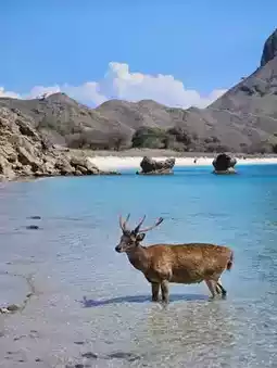 As soon as we reached Padar Island, I was instantly blown away by the scenery around the jetty, tucked into a beautiful bay. The water was crystal clear and so blue! To my surprise, there were also a few Javan deer strolling along the beach. Of course, the place was packed with visitors, but honestly, it wasn’t too overwhelming. Near the jetty, there’s a shaded waiting area, toilets, and even a small stall selling drinks—especially fresh coconuts. Right at the foot of the hill, next to the stairs, you’ll also find local vendors selling souvenirs like hats, fridge magnets, and more. Can’t really comment on the prices though—I didn’t buy anything.