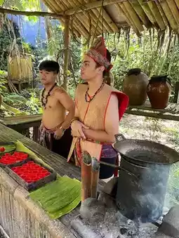 Mari Mari Cultural Village in Sabah offers an immersive journey into Borneo’s indigenous cultures. Located about 25 minutes from Kota Kinabalu, it showcases the traditions of five major ethnic tribes: Kadazan-Dusun, Rungus, Lundayeh, Bajau, and Murut. Visitors can experience traditional food-making and rice wine brewing, both integral parts of Borneo’s indigenous cultures. In the food-making demonstration, you’ll learn how local tribes prepare traditional dishes using age-old techniques, such as grilling over open flames or using bamboo. Additionally, you’ll witness the process of making rice wine, where tribal members explain the fermentation and brewing methods passed down through generations, offering a taste of authentic local flavors.