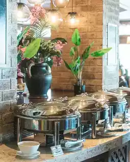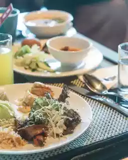 Freshly made egg dishes, curries, and other dishes are served on the terrace facing the harbour.