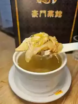 The stewed chicken soup with flower jelly and shark fin is very rich in ingredients, and it tastes sweet and clear.
