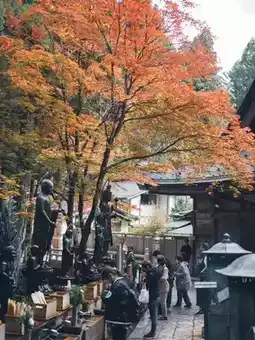 Experience the mystical autumn at Okunoin Temple on Mount Koya, enveloped in autumn leaves