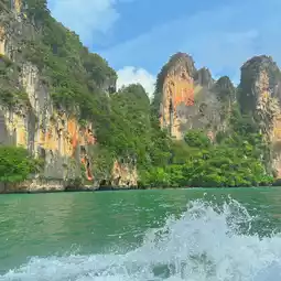 9:00 AM Take a long-tailed boat, Phetchinna Namchok, to Phra Nang Beach, a beautiful beach with a view of the stone mountains, cliffs and caves, surrounded by tourists and those who love rock climbing🐵⛴️