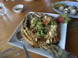 Khlong Kruat Seafood Restaurant is located by the river in Krabi Province. The atmosphere is cool and comfortable, with a gentle breeze and a natural view of the river and mountains. This restaurant is famous for fresh seafood from the local sea, including shrimp, shellfish, crabs and fish, which are meticulously seasoned. Recommended dishes include grilled shrimp, which have sweet and juicy meat and are served with a spicy seafood sauce, and crab stir-fried with curry powder, which is fragrant and rich. In addition, there is fried sea bass with fish sauce, crispy on the outside and soft on the inside, served with a spicy mango salad. This restaurant is perfect for a meal where you want to experience the taste of fresh seafood amidst a relaxing natural atmosphere.