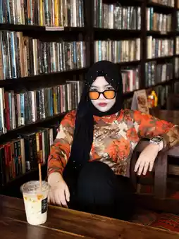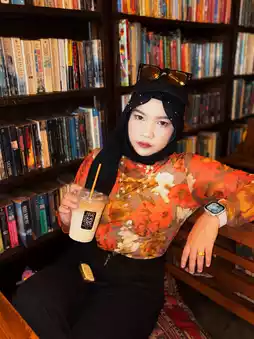 The café is decorated with wooden furniture and bookshelves filled with English books, creating the feel of a small library. Soft jazz music plays in the background, adding to the relaxing ambiance.