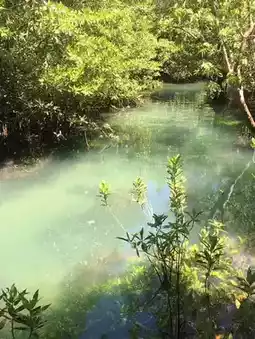 Dense mangrove forest, bright green contrasting with light-colored water, pleasing to the eyes