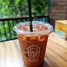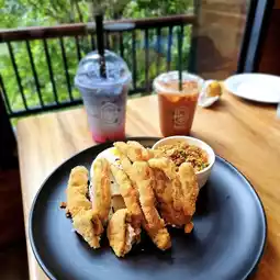 The café is located in Khao Thong Subdistrict, Mueang Krabi District, about 10-15 minutes from the city center. It is very convenient to drive. The shop is designed in a forest surrounded by trees. There is a wooden bridge to walk into the shop, adding a little adventure, but still maintaining the warmth of a cozy café.