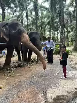 Baan Chang Cafe, Ao Nang, Krabi Province. Anyone visiting Ao Nang must stop by this elephant cafe first. It's located at the entrance to the Ao Nang hotel zone. Anyone who's been here, please share your thoughts on whether the cafe is good. Personally, I think it's quite well-made. The perfect combination of the cafe, the elephant feeding, and the tigers, deer, and elephants for photo opportunities is a signature of the cafe. As for the cafe, everything on the menu is delicious. You have to try it! #BaanChangCafeKrabi