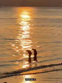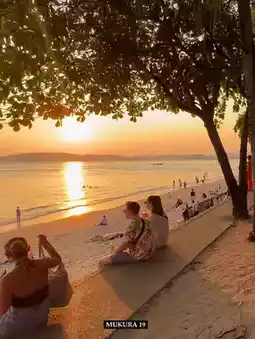 From around 5:30 PM onwards, tourists begin to arrive, securing spots on the beach or strolling along the shoreline, enjoying the cool breeze and the gentle sunlight. The golden sand reflects the beautiful orange light of the setting sun. Tourists, couples, families, and groups of friends come to enjoy the relaxing atmosphere.