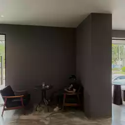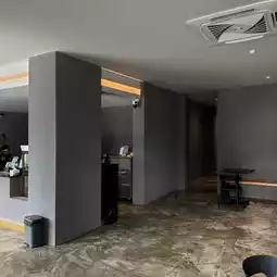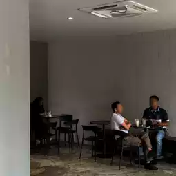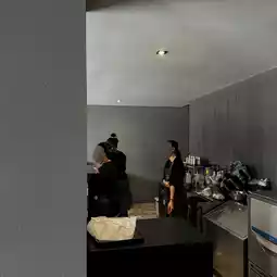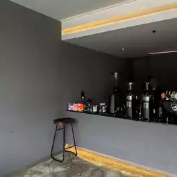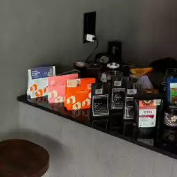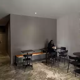 The shop's dark, black theme creates a calming, uncluttered atmosphere. The atmosphere is well-decorated, airy, and not crowded. There's ample seating, so you can sit comfortably. The drinks are delicious. They offer both coffee and decaffeinated beverages, as well as a selection of cakes.