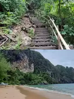 Pai Plong Beach is another hidden beach in Krabi with its own unique charm. While it's not as crystal-clear as some other beaches due to construction, which leads to some trash, its beautiful photo opportunities are a major draw. The towering limestone mountains contrast with the sand, and the stylish wooden bridge that runs along the rocks offer a truly natural feel.