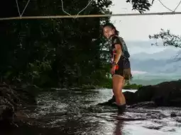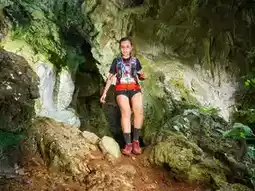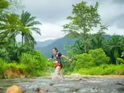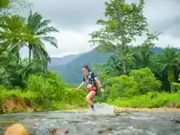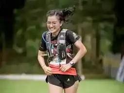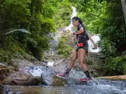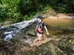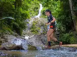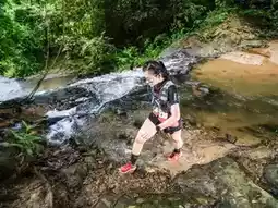 With 1 km left, we saw the exit sign, but it was slippery and tiring. My legs were sore and my toenails were sore, especially my big toe. My socks were torn and holding them up. Luckily, they didn't cut my toe, causing further pain. After we passed the stream, we had to run to the final stop, the Huai To Waterfall viewpoint, receive a wristband that looked like a hair tie, and then run back to the starting point.