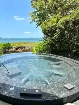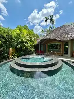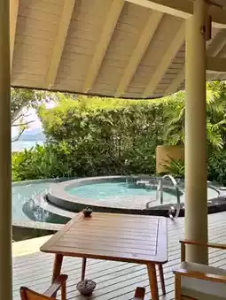 The room was beautiful with great views and a medium size—not as large as other room types, but the view and the round jacuzzi pool with powerful jets for a relaxing back massage made it worthwhile. (This is the only villa with a round pool.)