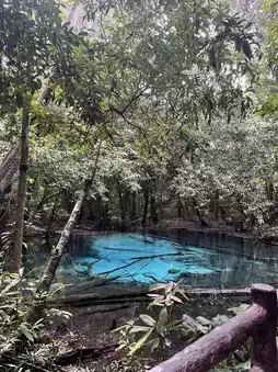 Emerald Pool is a famous tourist attraction with clear emerald green water contrasting with the surrounding green forest. This pool is located in Khao Pra-Bang Kram Wildlife Sanctuary. The water in Emerald Pool can change color depending on the day and sunlight. It consists of 3 hot pools: Sa Kaeo, Sa Morakot, and Sa Phut.