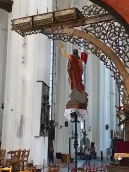 One of the most striking artistic treasures inside the church is the 14-meter-high astronomical clock, which is located in the niche on the north side and was designed by Hans Dilling.