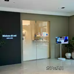 The white-themed interior features large windows and spacious seating. The cafe is open from 8:30 AM.