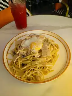 For my meal, I tried their truffle pasta topped with a runny egg—it was creamy, flavorful, and perfectly balanced. It’s hard to go wrong with something so comforting and delicious. The drink menu was equally enticing, and the refreshing berry soda I ordered was the perfect complement to my meal.