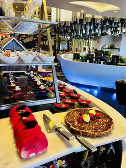 In addition to the seafood selection, guests can enjoy a variety of international cuisines. The buffet features interactive show kitchens serving dishes from Chinese, Indian, and Western culinary traditions. Highlights include dim sum, roasted meats from the carvery, freshly baked pizzas, and a diverse dessert sections (various cakes and chocolates) with live cooking stations. This is indeed one of the best luxurious buffet options in KL City.