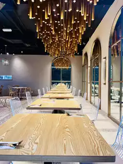 One highlight of the cafe design is it emphasises green garden aesthetic, featuring floor-to-ceiling windows that allow natural light to illuminate the spacious interior. The use of lattice floor tiles, brick walkways, and light wood furnishings enhances the airy ambiance, creating a comfortable environment for guests.