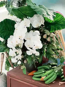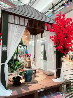 Interspersed among the floral splendor are stunning Malay elements that evoke the spirit of tradition and festivity. Traditional Malay hats, or tanjaks, hang gracefully from bamboo poles, while warm Malay oil lamps cast a soft, flickering glow, adding a touch of nostalgia and charm. Rotan birdcages, intricately woven, add a rustic yet timeless appeal to the scene. The gentle breeze stirs the vibrant foliage, and the combination of these unique touches creates a Spring Raya atmosphere that’s both peaceful and celebratory—perfect for embracing the festive spirit of renewal and togetherness.