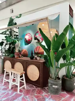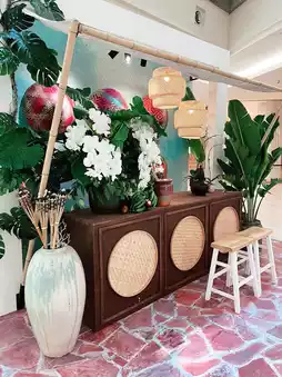 Step into a vibrant fusion of spring and Raya at Gardens Mall, where the enchanting beauty of blooming flowers meets the rich heritage of Malay culture. The scene is alive with an array of spring florals, including moth orchids in shades of lavender, white, and soft pink, cascading around the space in a floral embrace. Golden Areca palms stand tall, their lush greenery complementing the delicate vines of golden pothos, which drape elegantly from overhead trellises.