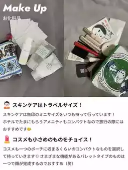 I always bring travel-size skincare products from MUJI! Hotel amenities are also compact and great for travel ☺️.