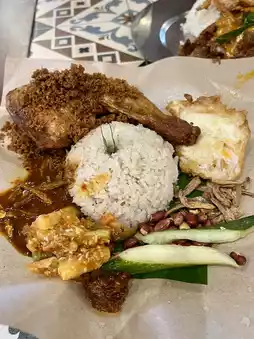 The restaurant is decorated in a vintage style and is located in the Chinatown area of Kuala Lumpur. The location is convenient. Their Nasi Lemak is a fusion style, which is very delicious for first-timers. The chili paste and curry paste are not too strong in smell. They also have other dishes. We like the fried chicken topped with salted egg sauce. Their famous dessert is Malaysian cendol, a longan dessert floating in pandan water mixed with fresh calamansi, which is very refreshing.