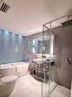 • Private bathroom with separate bathtub and rain shower, plush bathrobes, deluxe bath products, and hairdryer