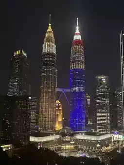 The Petronas Twin Towers project the colors of a visiting head of state’s country onto the building. When I traveled, the King of Brunei was visiting, so I was able to enjoy a unique night view.