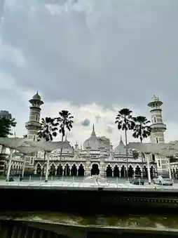 As I crossed the bridge linking Merdeka Square to the old heart of Kuala Lumpur, I caught my first glimpse of Masjid Jamek—the oldest mosque in the city, nestled at the confluence of the Klang and Gombak rivers. Surrounded by colonial architecture and the quiet rhythm of water, the Sultan Abdul Samad Jamek Mosque stood peacefully, framed by palm trees and Moorish domes.