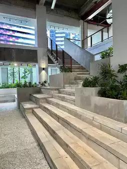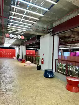 Once a modest mall near the bustle of Jalan TAR, Semua House now turns heads with its confident post-renovation identity. Open-air walkways, giant fans, industrial steelwork, and polished concrete set the tone—but it’s the signature spiral slide staircase that steals the show.