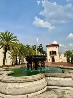 The main courtyard, framed by symmetrical colonnades and Andalusian-inspired horseshoe arches, is centered around a serene stone fountain—a detail both ornamental and symbolic. Water trickles gently into the basin, reflecting domes above and creating an atmosphere of quiet elegance. It’s a space designed to inspire thought as much as admiration.