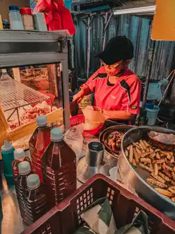 The setup is simple—just a stall by the roadside with plastic stools and bustling energy from nearby food vendors—but the taste is unforgettable.