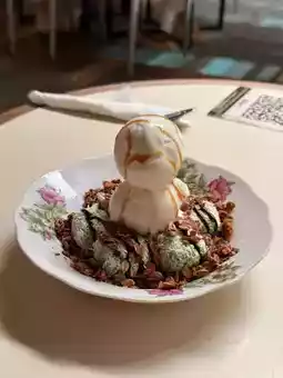 Ending with a special dessert, the Onde Onde ice cream is served with light green mochi filled with just the right amount of sweet coconut sugar. The refreshing ice cream and the soft, chewy mochi offer a sweet and creamy taste without being overwhelming, with a generous filling that impresses. This dessert is definitely worth trying.