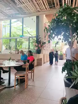A healing space surrounded by greenery both inside and outside. The seats are spacious, quiet, and relaxing.