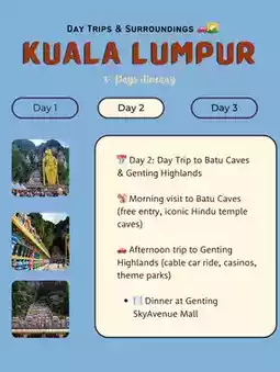 • 🐒 Morning visit to Batu Caves (free entry, iconic Hindu temple caves)