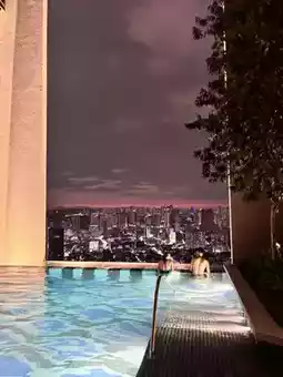 ・The Twin Towers are visible from the pool, offering a spectacular night view. 🌉