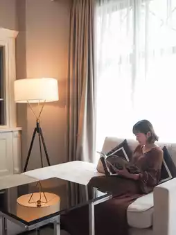 The interior has a classic-modern vibe overall, with calm tones that create a relaxing atmosphere.