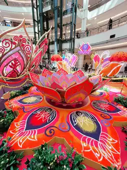 Surrounding it are elaborately decorated peacocks, lotus motifs, hanging diyas, and rich floral garlands that echo the spirit of Deepavali. The ambience is warm, spiritual, and utterly photogenic, with soft lighting that mimics the glow of thousands of oil lamps. Visitors can also explore Indian-themed stalls selling festive sweets like laddu and jalebi, savoury snacks, handmade crafts, and traditional clothing — a perfect way to experience the colours, tastes, and soul of Deepavali.