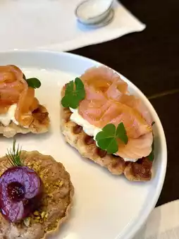 • Pulpit Rock Smoked Salmon Waffle — Smoked salmon waffle served with apple and horseradish.