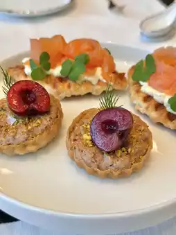 • Duck Rillette Pie Tee — Mini pie filled with seasoned duck rillette, served with cherry and pistachio.