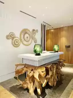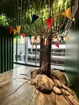 Step into the lobby of Hotel Indigo Kuala Lumpur on the Park, and you’ll immediately feel the city’s rhythm merging with nature’s calm. A lush double-height green wall sets the tone, while the stunning central staircase—crafted from reclaimed railway sleepers and rebar—tells a story of renewal. The reception desks, made from old tree roots, celebrate the beauty of rebirth, and a striking sculptural tree adorned with glass bottle branches captures the hotel’s creative soul. It’s sustainability reimagined in style.