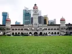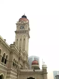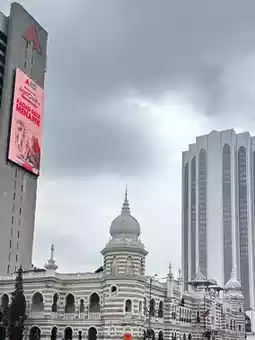 The architectural ensemble around Dataran Merdeka in Kuala Lumpur, including the grand Sultan Abdul Samad Building and surrounding heritage structures, showcases distinctive Moorish and Indo-Saracenic styles. Characterized by striking red bricks and white plaster arches, these buildings are adorned with onion domes and towering clock towers. Standing alongside modern skyscrapers, these colonial-era edifices form a cityscape that bridges history, serving as vital symbols of Malaysia's cultural heritage.