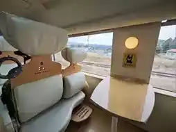 The train is well-equipped with a cozy cafe that serves food and drinks and sells unique merchandise. There is a children's area and a play area filled with joy. One carriage even has comfortable sofa seats, offering a very relaxing experience. All seats are reserved and must be booked one month in advance on the Kyushu official website, with an additional reservation fee of 1500 yen. The train runs routes from Kumamoto to Aso and Kumamoto to Beppu. For specific times, please refer to the official website.