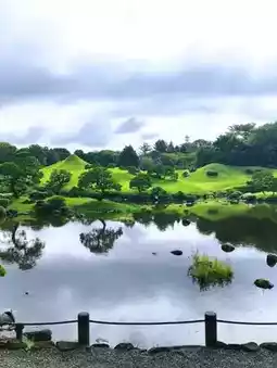 2. The garden features a picturesque lake with reflections, perfect for photography.