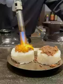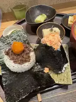 - Rare miso and Aka beef with egg yolk minced meat onigiri
