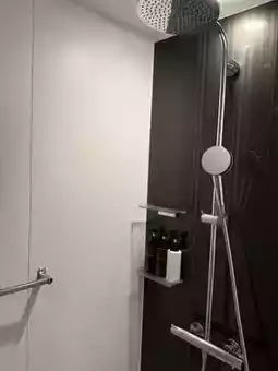 Combined with subtle lighting and extended mirrors, the space feels like a boutique hotel.