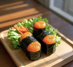 Buy "Persimmon Leaf Sushi" (Photo: Close-up of the sushi platter wrapped in green leaves).