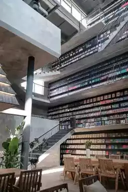 The book wall is designed by cleverly utilizing the high floor height of the old factory.