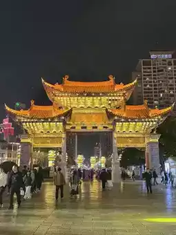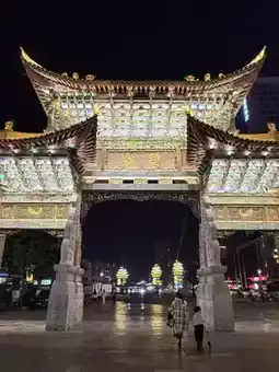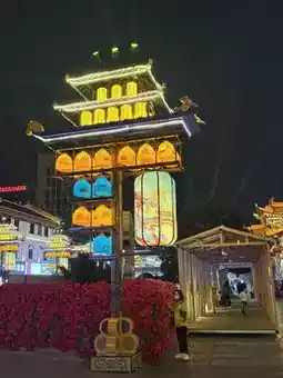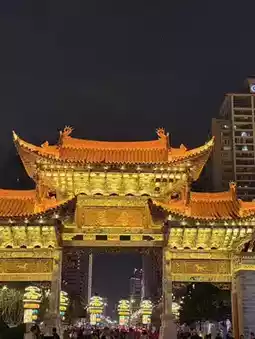 These are two gates in the Jinbi Square pedestrian street area. They were built during the Ming Dynasty and are more than 400 years old. They are placed parallel to the east and west. It is said that if the sun and moon meet in the sky, the shadows of the two gates will overlap. We came at night and the lights were on, which was very beautiful. This place is popular for organizing activities and setting up booths.